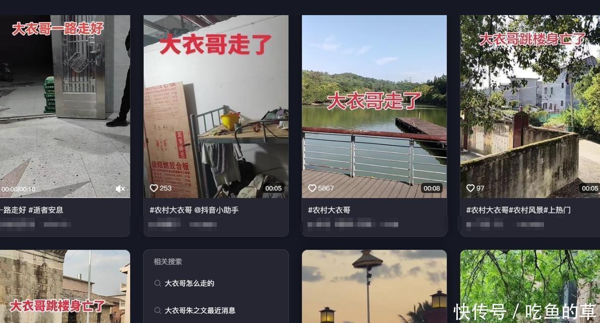 民间那些各式各样的丧葬音乐,再搭配些毫不相干的风景或其他画面,接着用红字写上“大衣哥跳楼死了”,这做法真是一点儿都不忌讳啊。12月12日那天,他明明穿着红衣服去西双版纳表演的视频都摆在那儿了,清清楚楚的,结果13号还是有人在网上一副哭天抢地的样子。